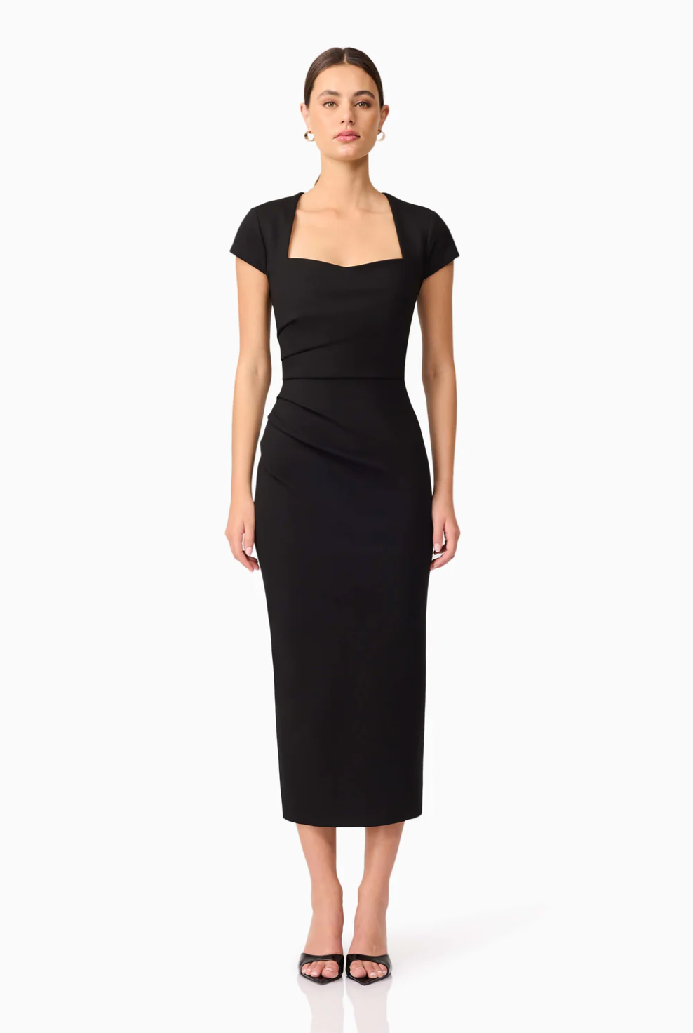 Refined and endlessly versatile, the Alina Fitted Midi Dress in Black is a timeless wardrobe staple designed to flatter. Cut from a structured ponte fabrication, this elegant cap sleeve midi dress offers both comfort and polish, making it a perfect choice for everything from cocktail parties to corporate events.