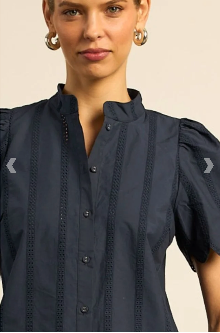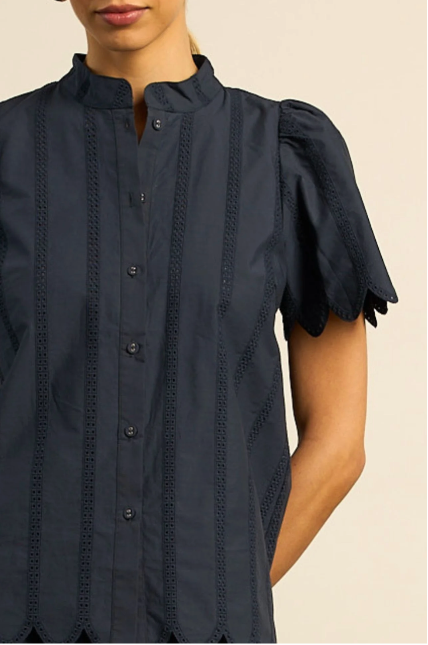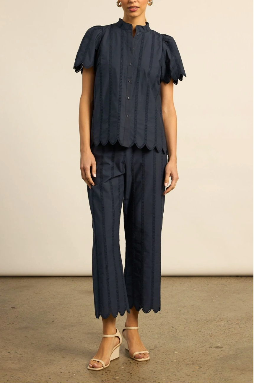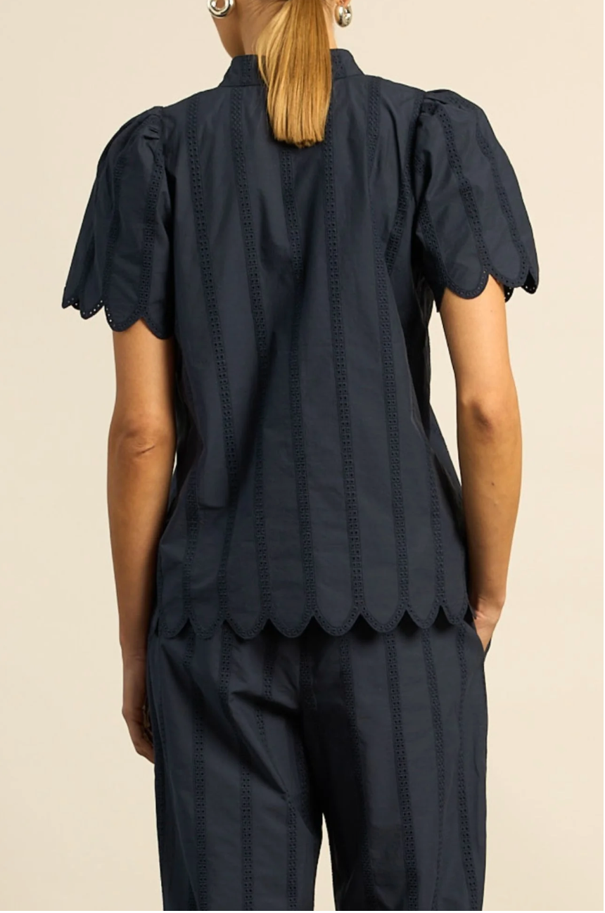 The pier top is elevated with cotton broderie that finishes in scalloped cuffs and a scalloped hem. a high neck-stand lends structure, while colour-matched fabric buttons elevated with classic shirt with a twist. designed for versatility, it pairs seamlessly with the pair with the 'harbour pant in midnight'for an elegant seasonal look.