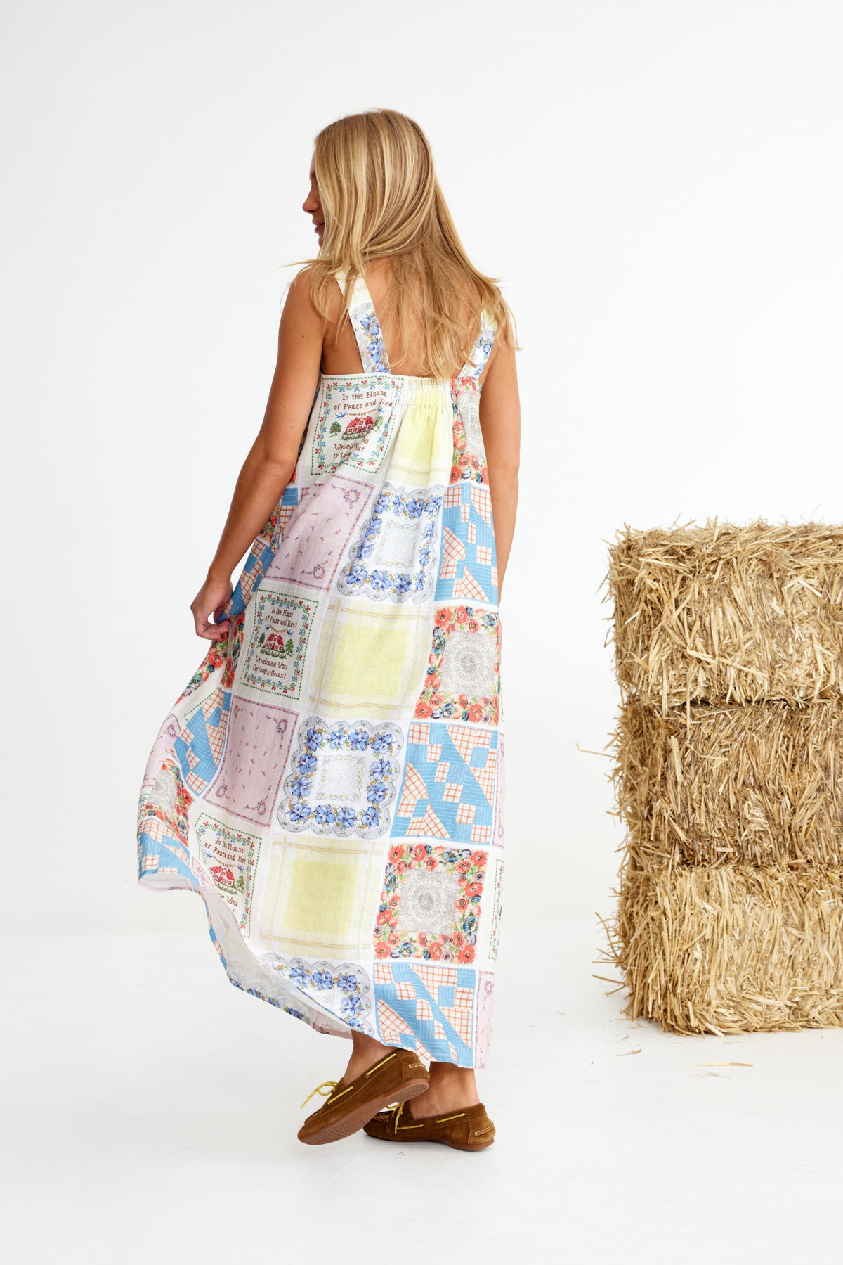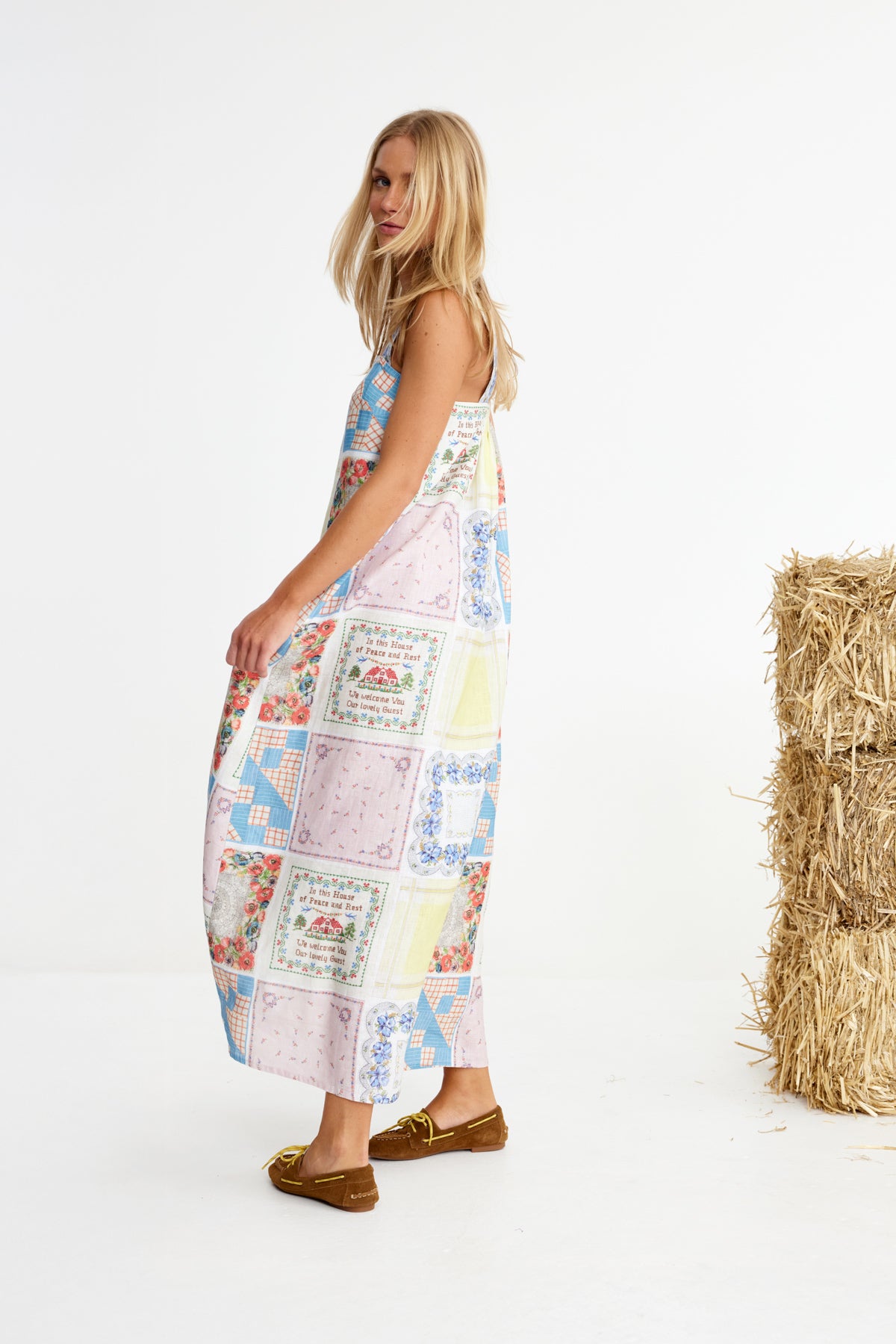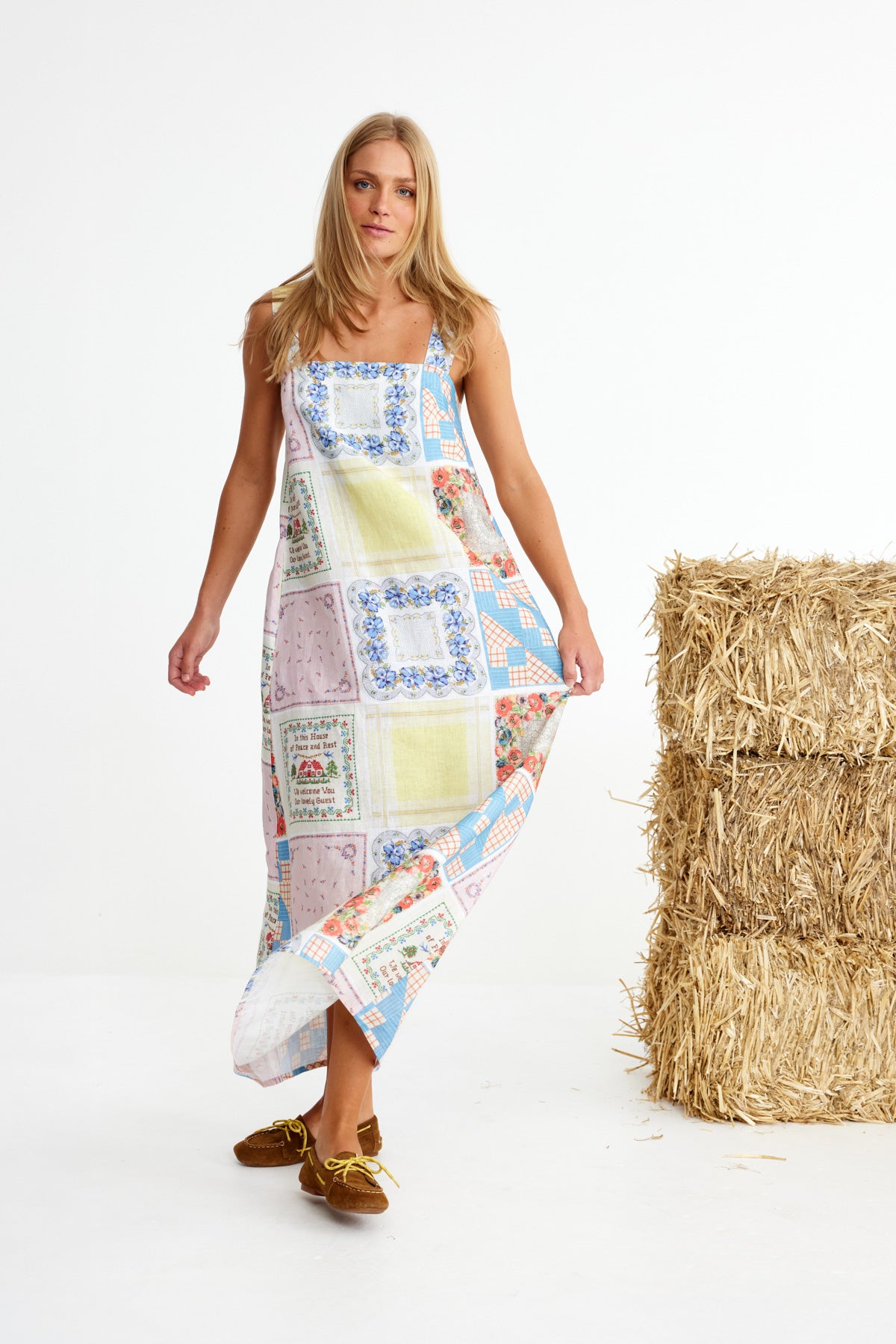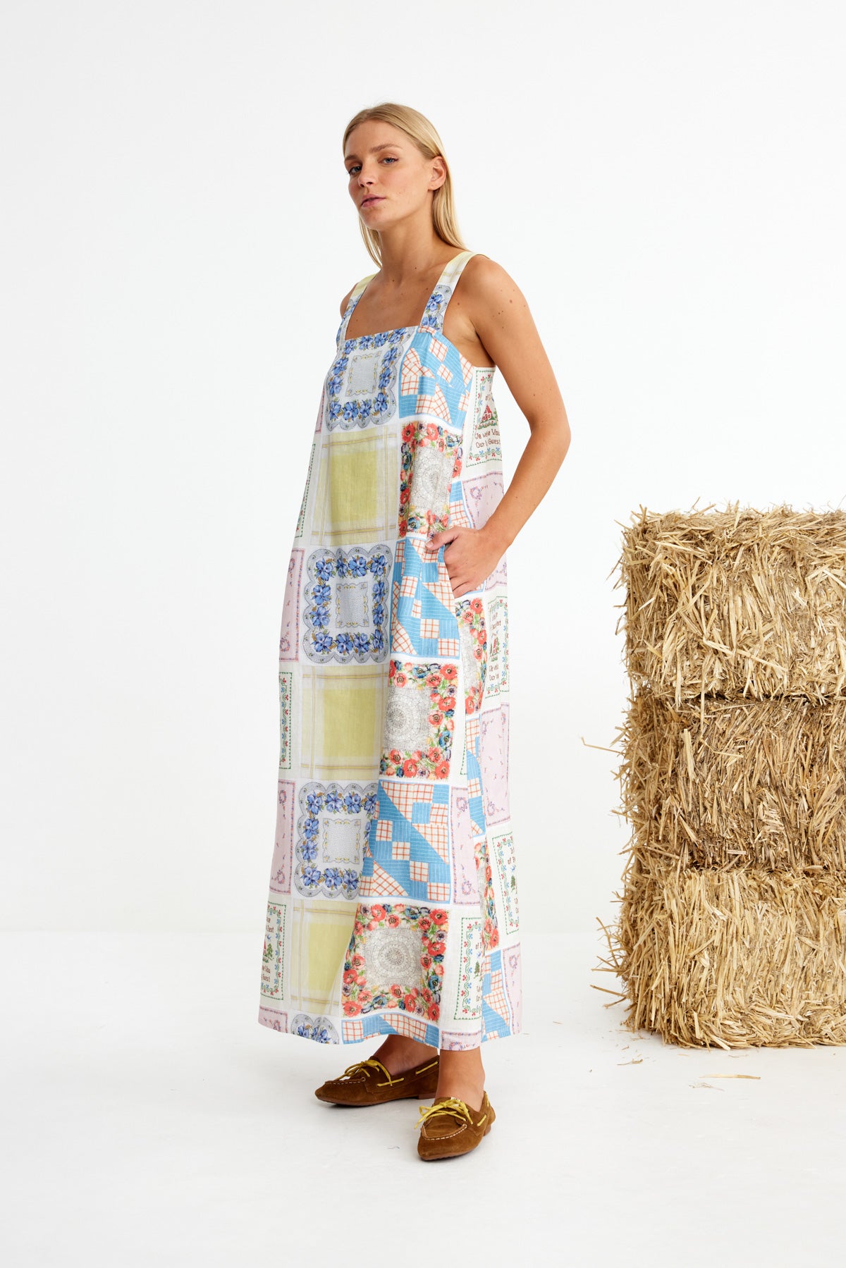 Bending Poles. For those not famil, its racing your ponies through a series of poles. Excellent. And just as cute simple good fun a sundress stitched with stories. Cut from 100% linen & patterned with a patchwork of daintiest vintage handkerchief designs. Cute as a cucumber. Scallop florals, sweet checks, cross stitched homespun charm. Removable shoulder straps, an elasticated back, deep side pockets keep it easy & unfussy, whether you’re leaning on the fence rail or festivals, footloose & fancy free. The kind of dress that says you’ve inherited both style & a trunkful of tales.