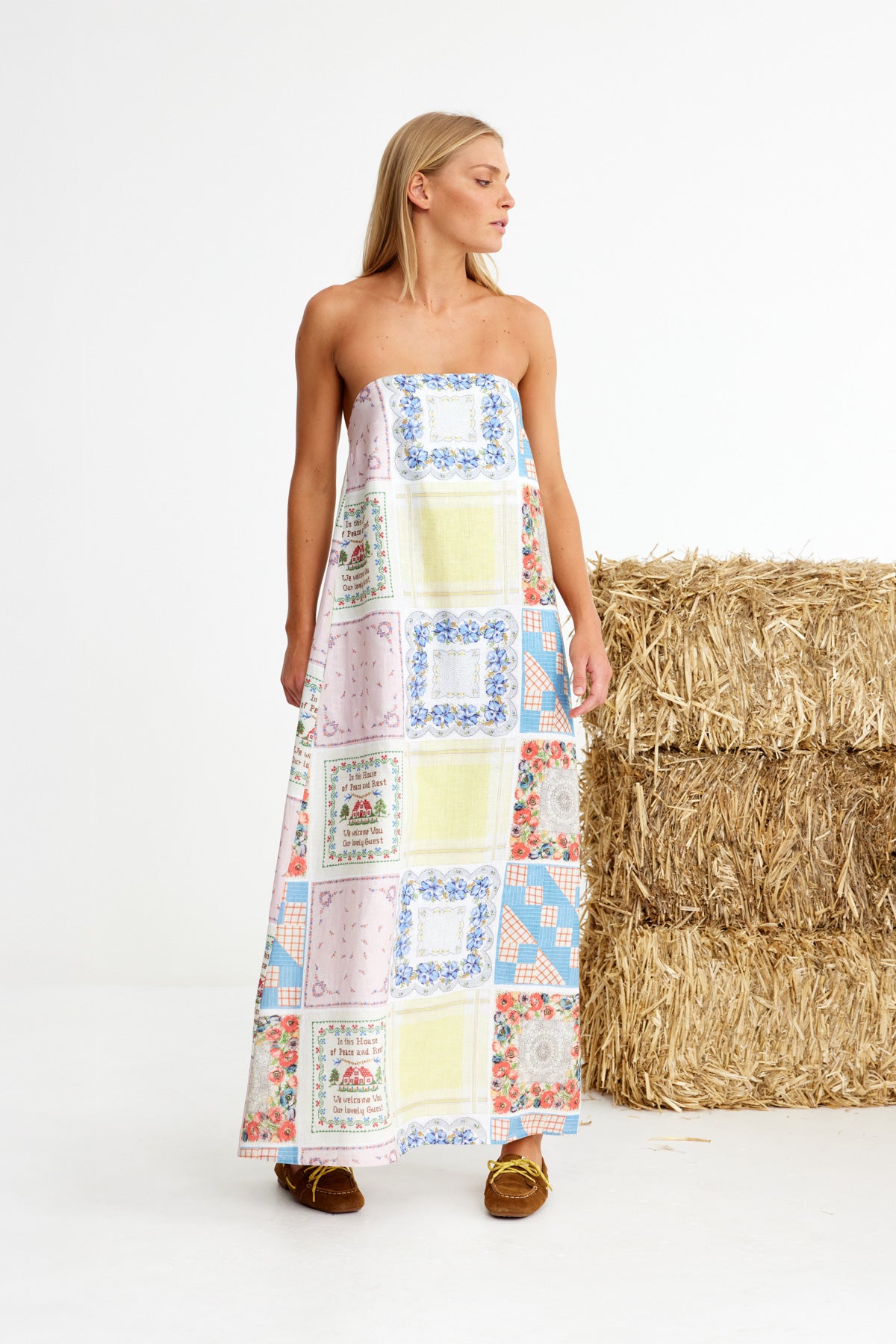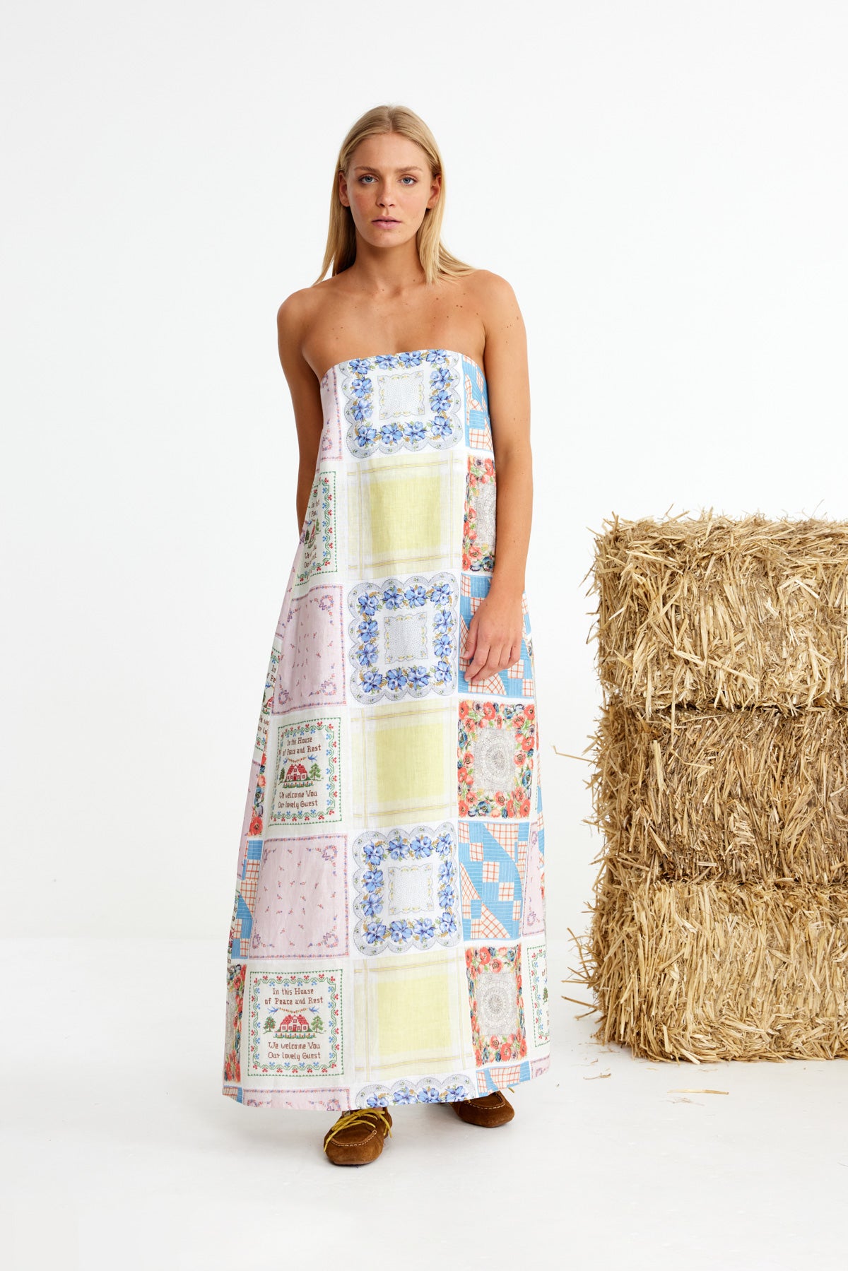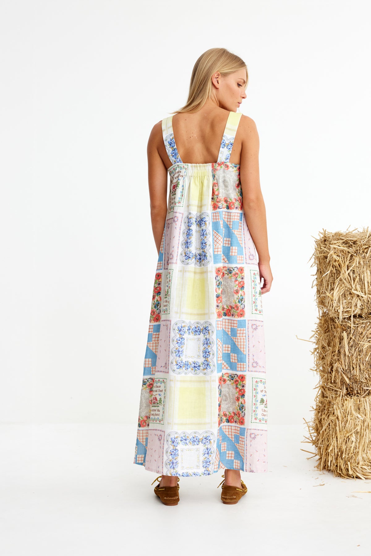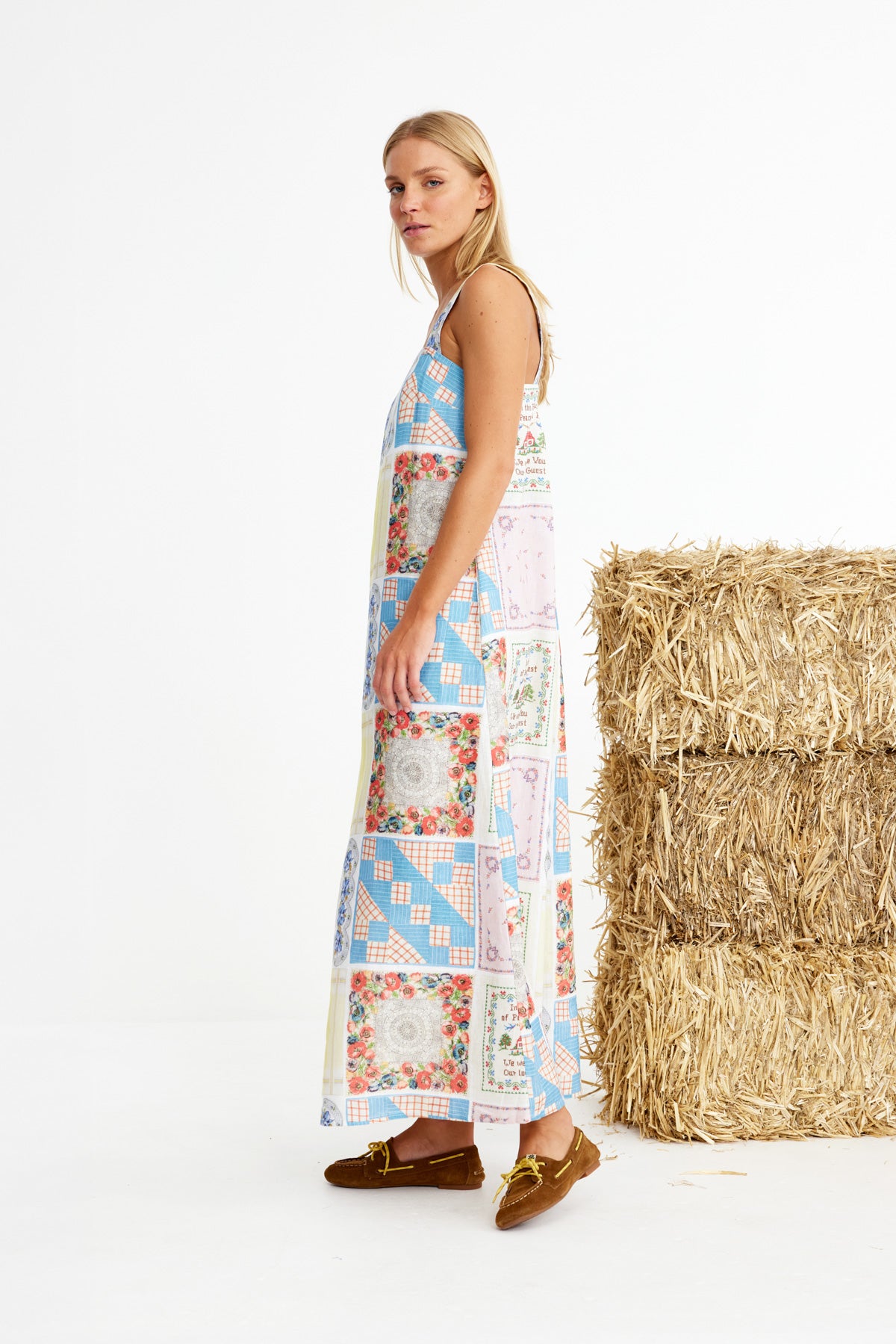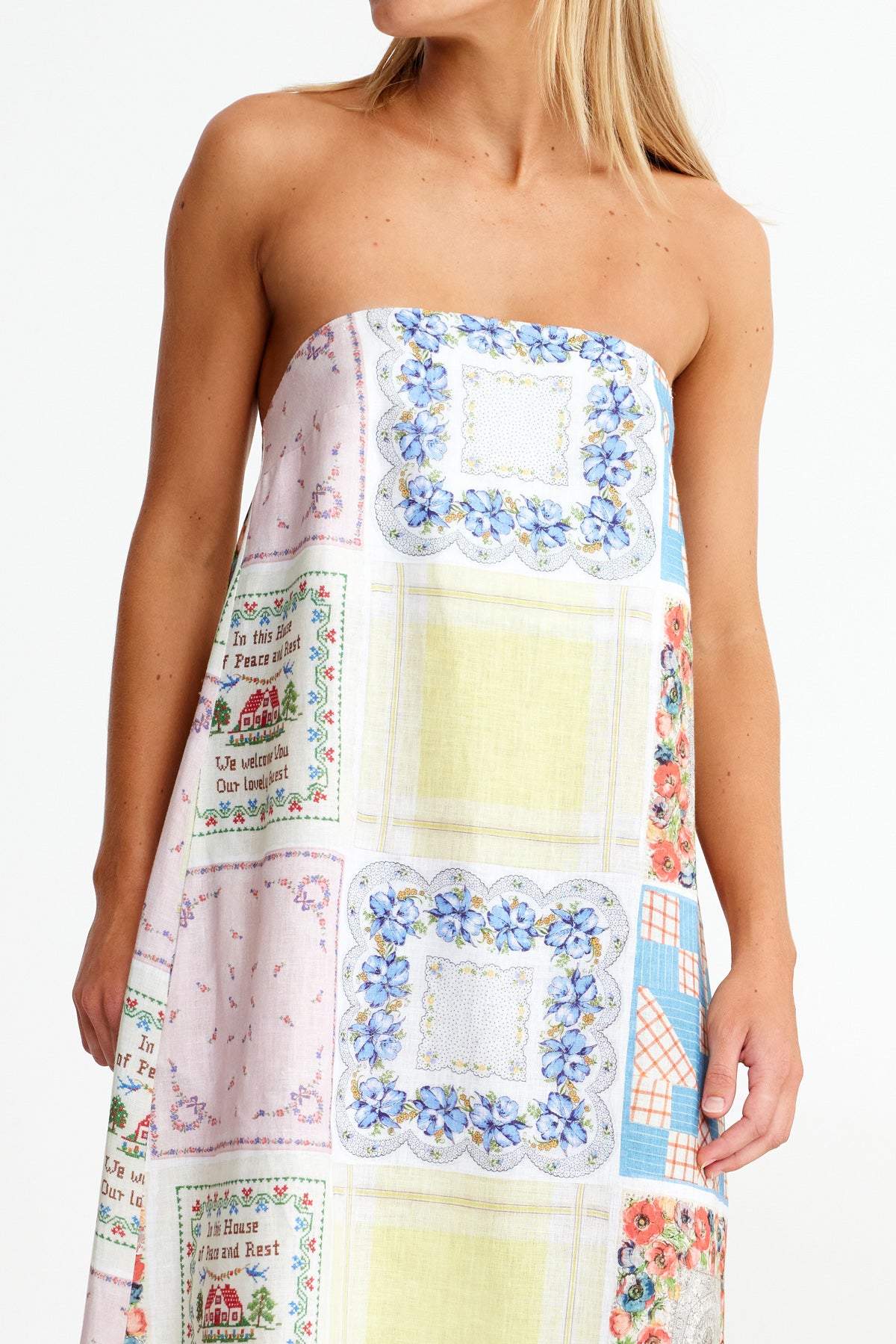 Bending Poles. For those not famil, its racing your ponies through a series of poles. Excellent. And just as cute simple good fun a sundress stitched with stories. Cut from 100% linen & patterned with a patchwork of daintiest vintage handkerchief designs. Cute as a cucumber. Scallop florals, sweet checks, cross stitched homespun charm. Removable shoulder straps, an elasticated back, deep side pockets keep it easy & unfussy, whether you’re leaning on the fence rail or festivals, footloose & fancy free. The kind of dress that says you’ve inherited both style & a trunkful of tales.