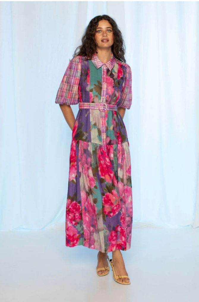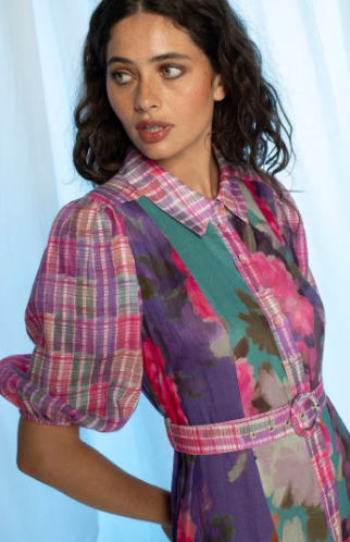 Designed with a high collar, button-up front, and puffed short sleeves for a fresh, feminine feel. The adjustable belt adds a flattering cinch at the waist, giving this effortlessly elegant silhouette a modern, wearable edge.