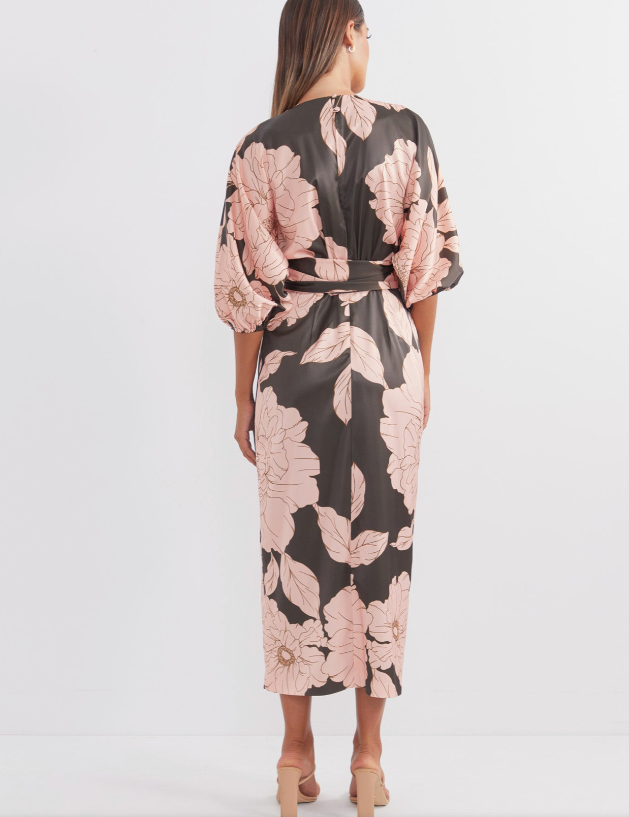 The Favourite Wrap Midi by PASDUCHAS features an exclusive floral print on lustrous satin-backed crepe. It has a tulip-style mock wrap secured at the waist with a self-tie, cinched to flatter, while bat-winged sleeves are secured by elastic at the elbow, balancing the blouson bodice. The skirt section falls to a traditional midi-length hem, creating a modest silhouette. Fully lined from the waist down with an invisible zip at the centre back.