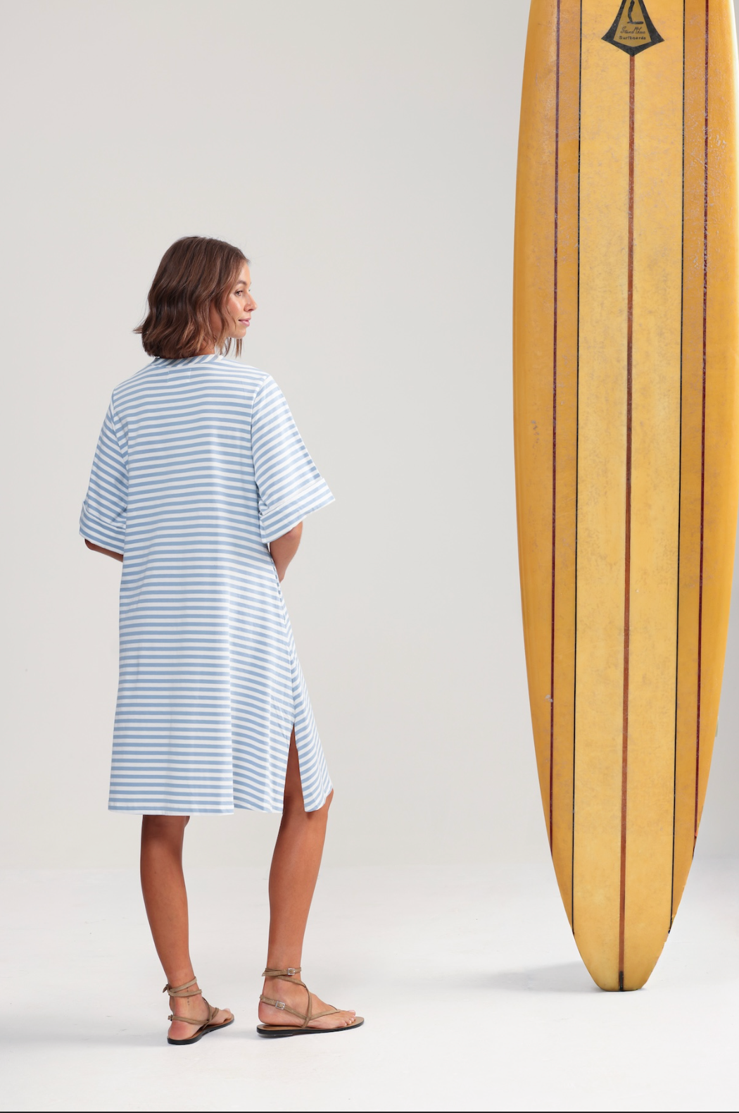 Meet 42 MILE - the shorter, cheekier sister to LONG BEACH. Same soft jersey, same comfy cuffed sleeves, just cropped to knee-length for hot days and bare legs. Pull it on after a swim and go find chips.