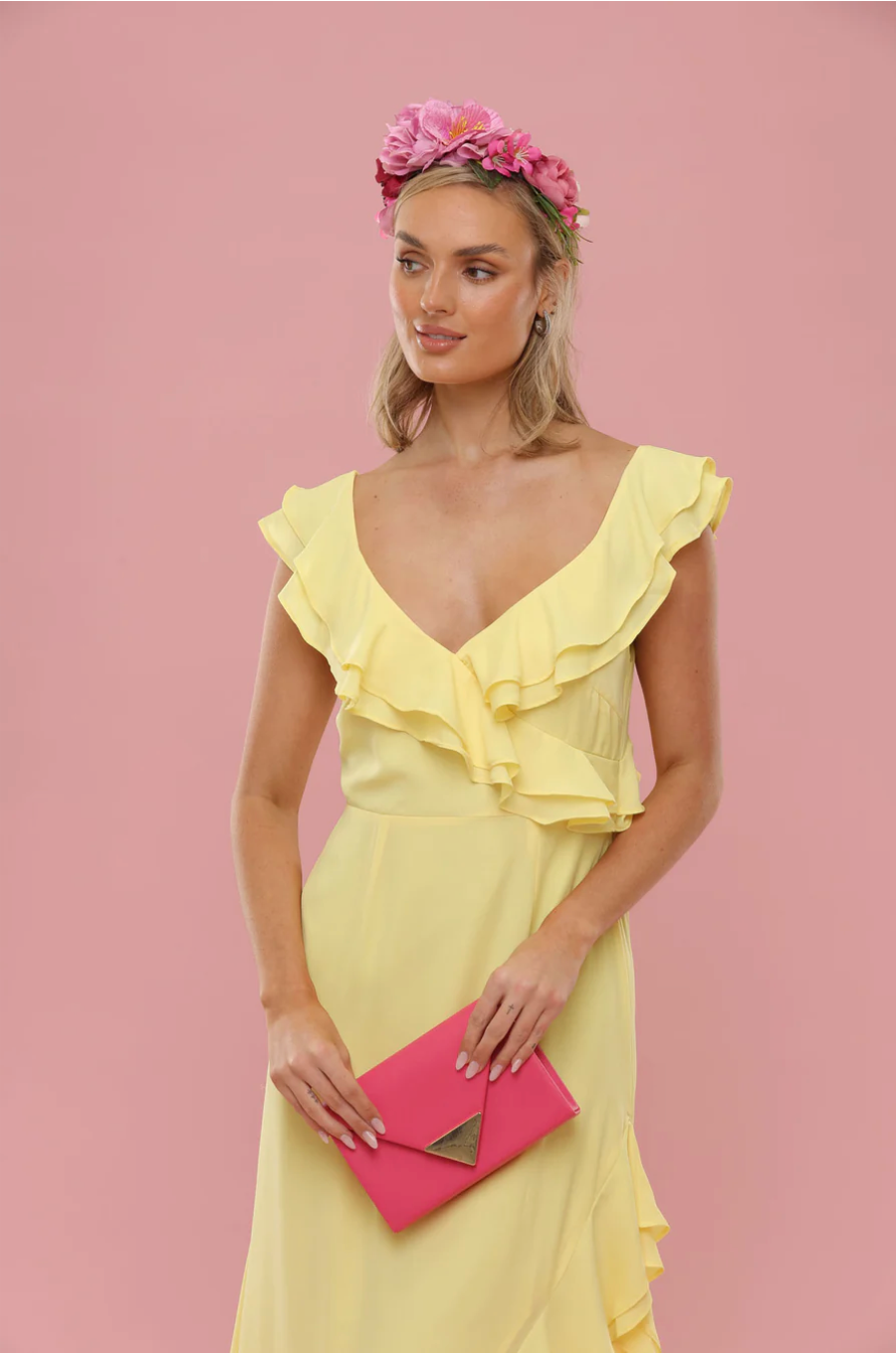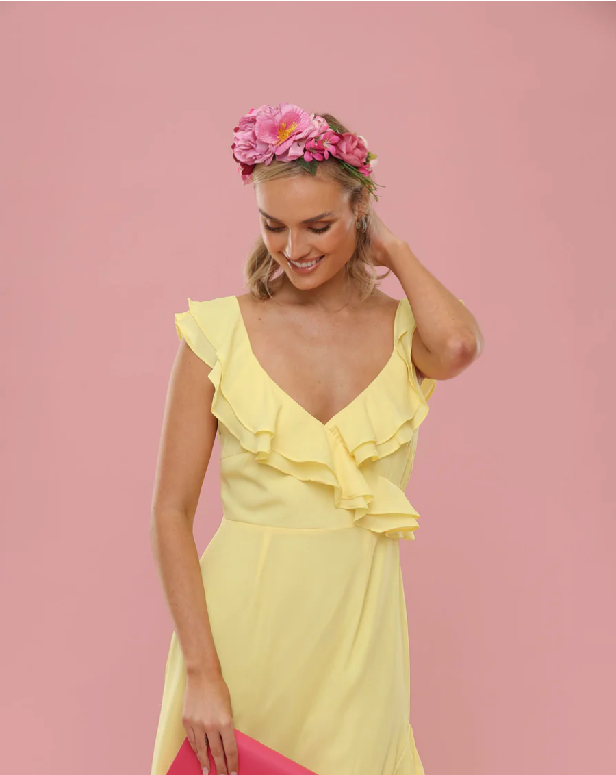 The Morgan & Taylor Dori Fascinator the perfect flower crown to stand out for your special occasion. Featuring Hot pink and Burgundy petals set against simple green foliage.