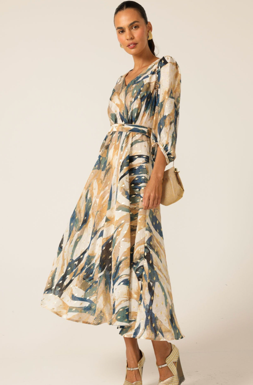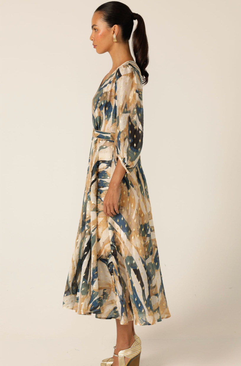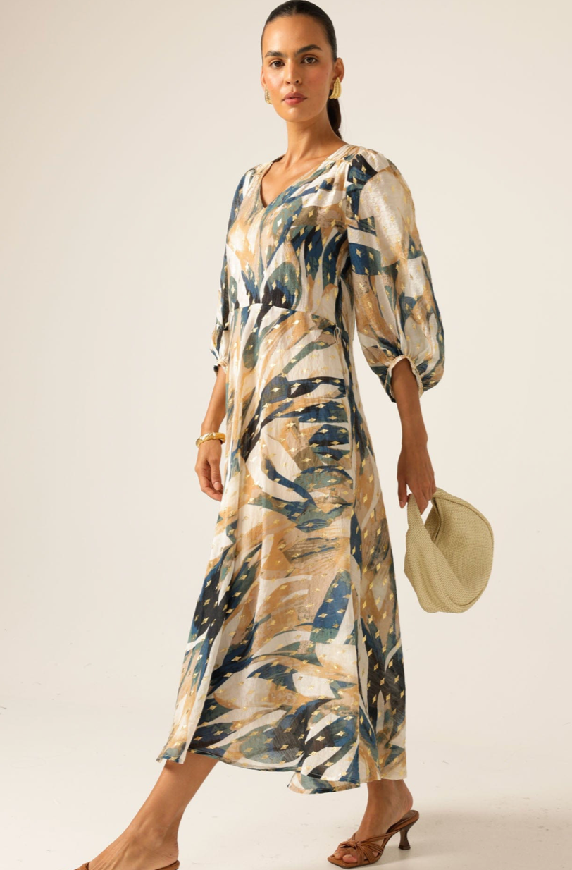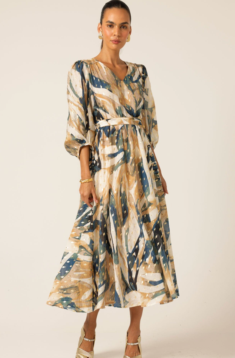 Made from luxurious cotton with gold metallic detailing, the La Mer Midi Dress features a soft bloused sleeve, midi length, and delicate gold-beaded trim on the belt and shoulder panels. The relaxed silhouette can be cinched with the detachable self-tie belt, making it a versatile choice for both elevated events and effortless everyday wear.