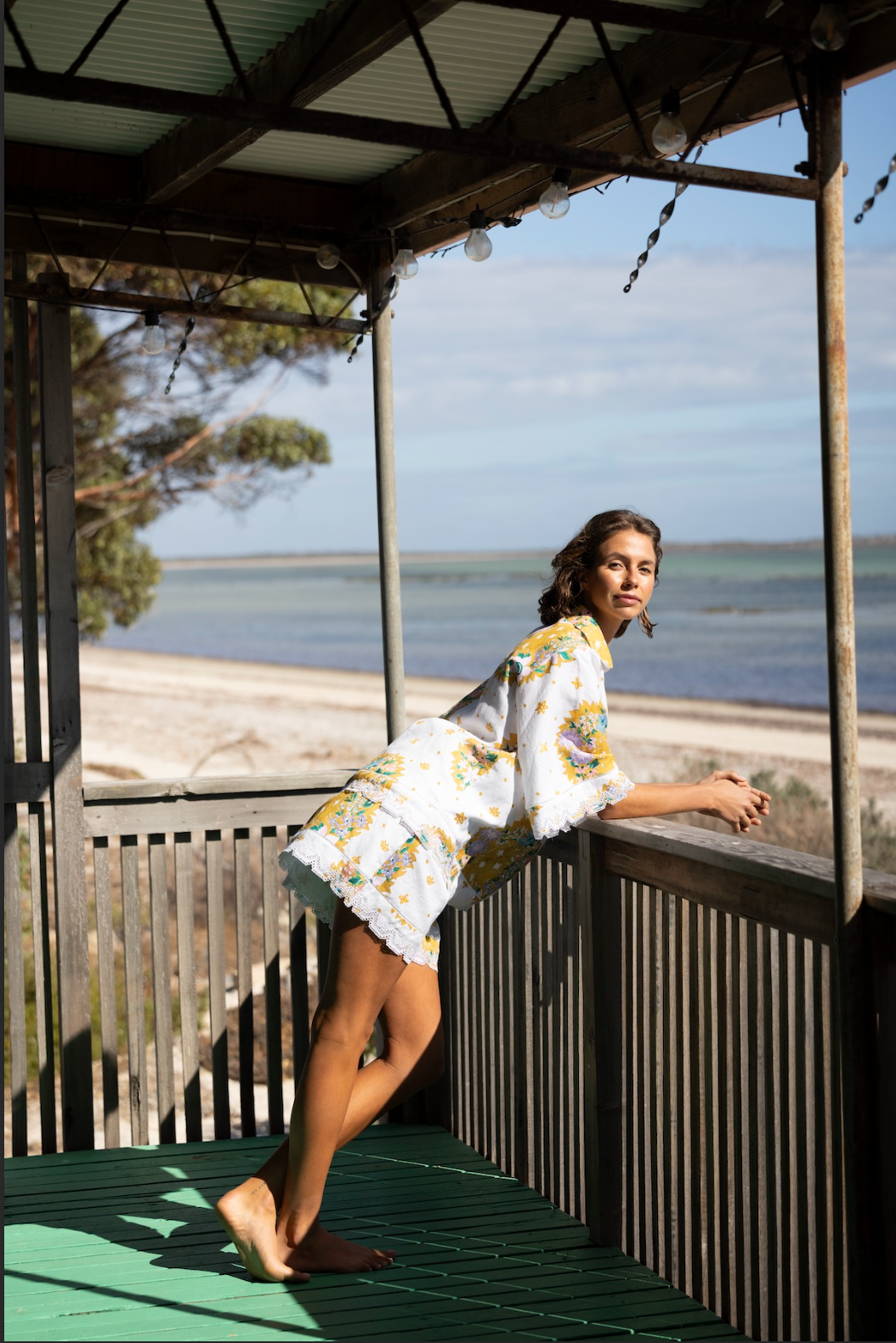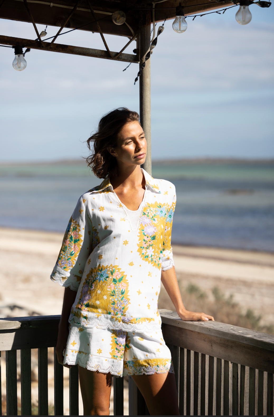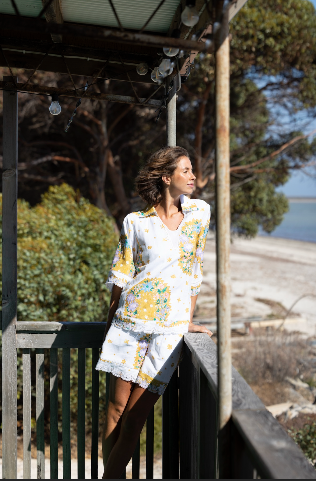 We love a top with jeans. Or shorts. Or chinos. The prettiest summer sunkissed floral with prettiest trim details & scalloped bottom hem. Throw it on any of the above or the matching THE FARM shorts. 2 MASSINGER STREET is an easy, simple throw on & go fit with floral patchwork, a soft deep vee, and delicate scallop lace trims. Made for slow days and coastal cafés and summer holidays. We can't wait.