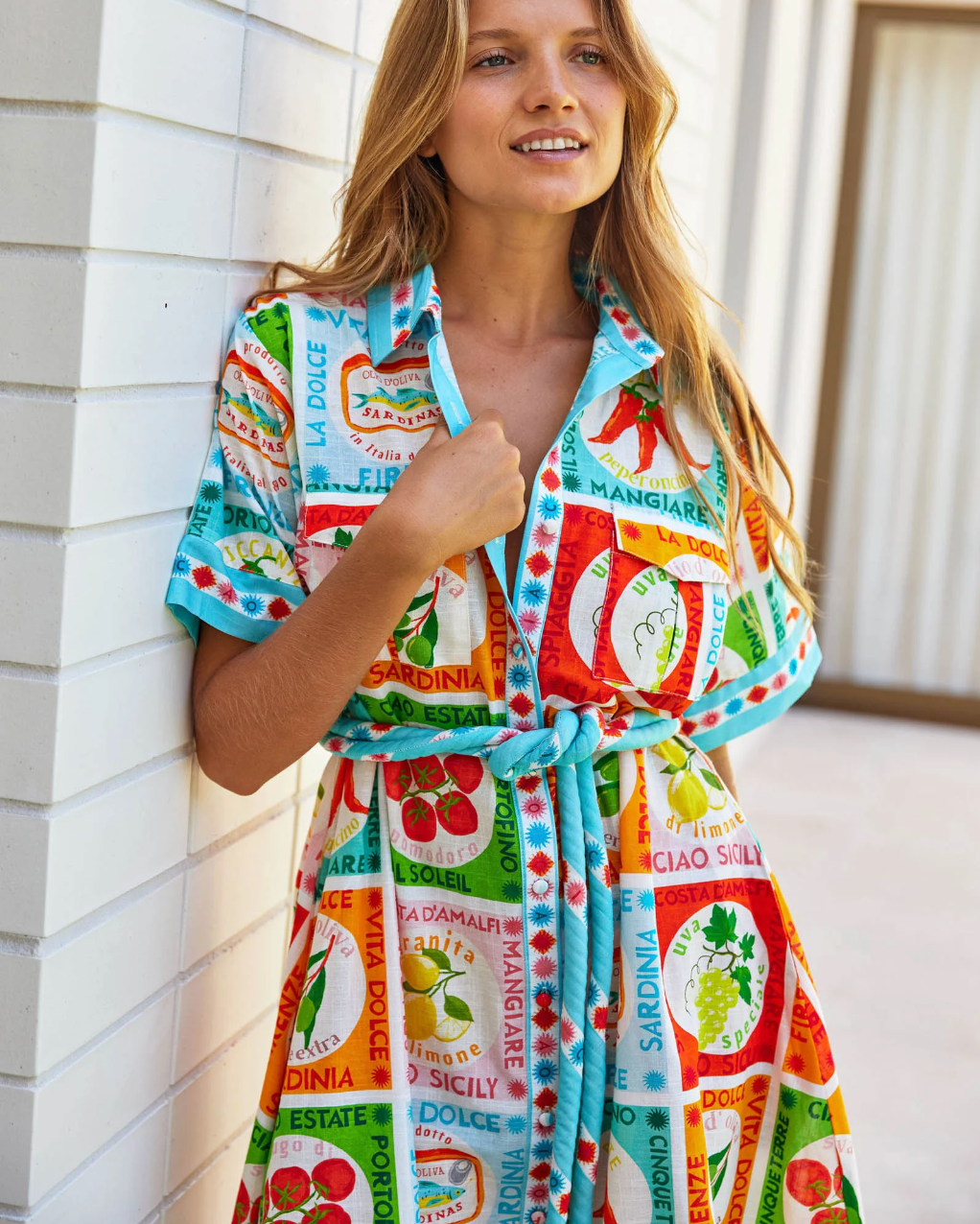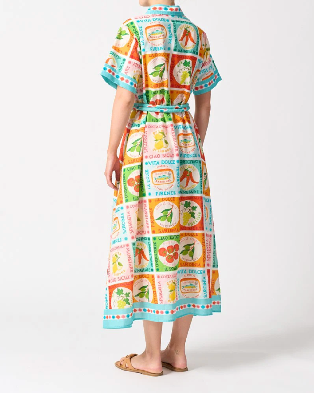 A vacation-ready statement piece, the Cannes Dress in Ciao Sicily is a playful ode to la dolce vita. Featuring an all-over nostalgic Italian print with vibrant motifs and sun-soaked colors, this button-up midi dress is both bold and breezy. The short sleeves and collared neckline bring a relaxed polish, while the removable waist tie lets you cinch it in or wear it loose.