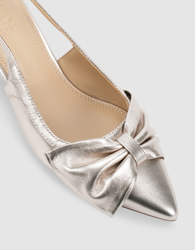 Perrie by Nude Footwear is a standout slingback in leather. Featuring a softly gathered bow detail and a flared block heel, this elegant style brings playful femininity to any look. Perfect for party season or adding a glamorous twist to your everyday edit.