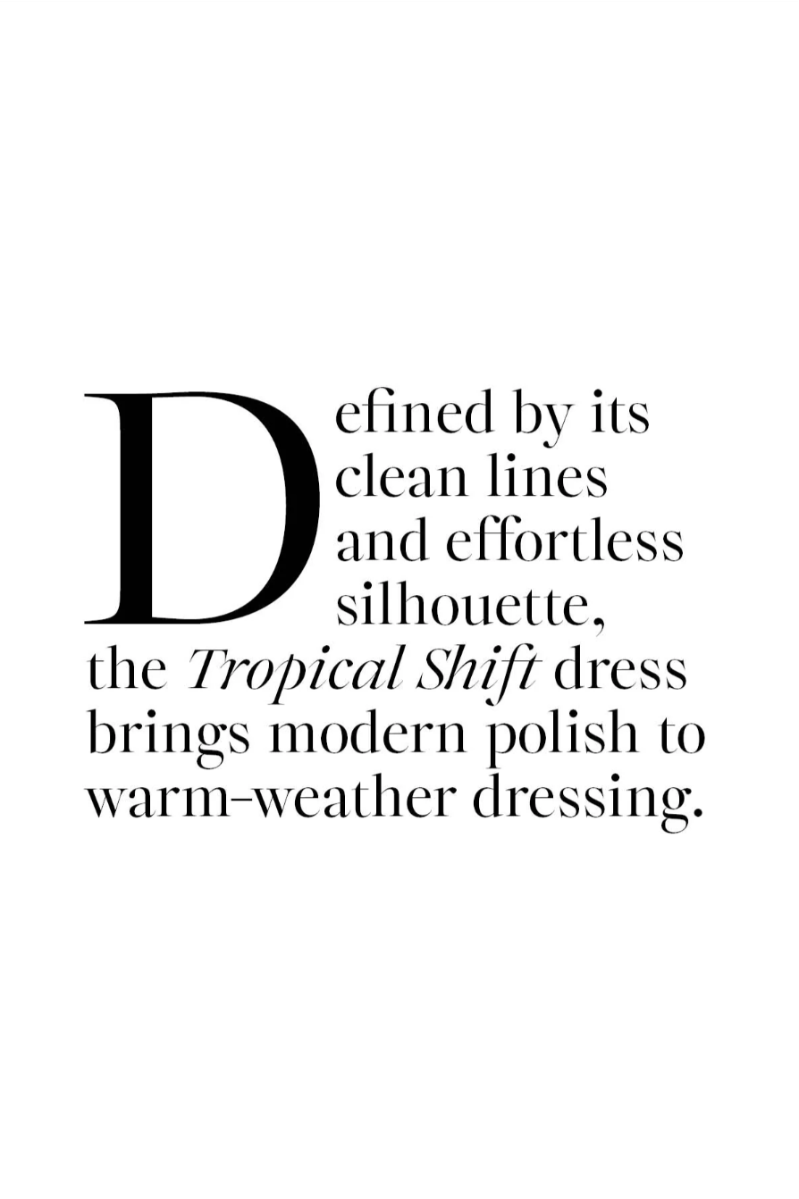 Defined by its clean lines and effortless silhouette, the ‘Tropical Shift’ dress brings modern polish to warm-weather dressing. Crafted in crisp ‘Sunset Boulevard’ cotton, its boat neckline and simple shift shape are elevated by tropical-inspired embroidery, creating a fresh yet timeless look.
