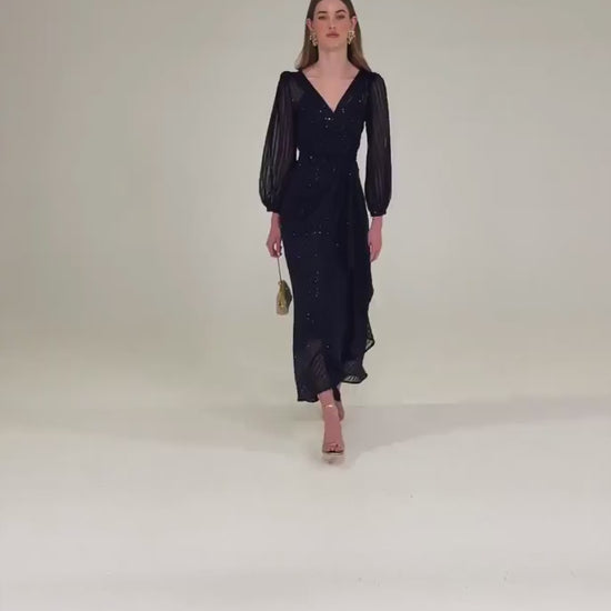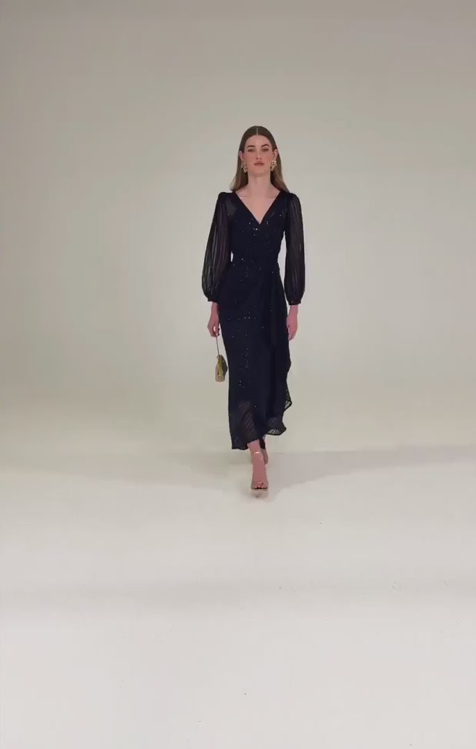 The Sierra Dress is made from lightweight chiffon with shimmering multicoloured flecks, showcasing SACHA DRAKE’s iconic wrap design. Adjustable waist ties, a stretch jersey slip, soft front pleats, and a hi-lo maxi hemline create elegant movement for weddings and formal events.