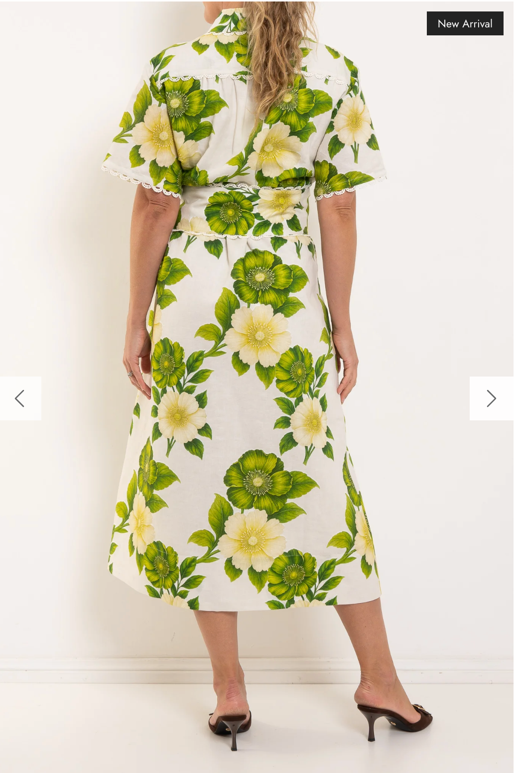 The Kinney Sierra Dress in Le Jardin blooms with vintage-inspired florals on a beautifully breathable linen-cotton blend. Designed with a relaxed midi silhouette, soft lace trim details and a flattering self-tie waist, it effortlessly balances romance with wearability. The short sleeves and lightweight fabrication make it perfect for warm days, while the button-through front and pockets add practical polish you’ll love.