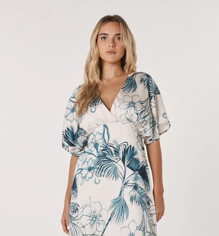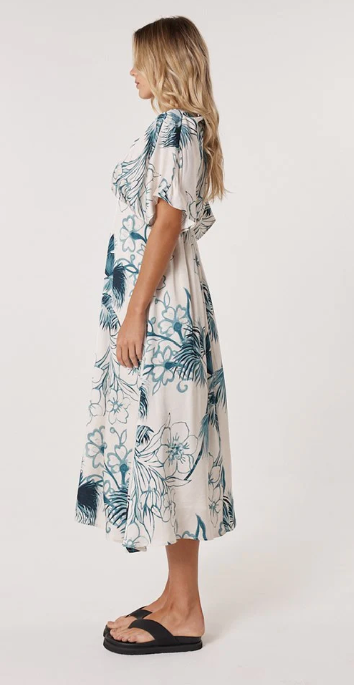 The Solstice Palms Midi Dress embodies soft structure and quiet sophistication. With a V-neckline, flutter sleeves and elasticated waist, it shapes the body with ease. Its exclusive print adds a touch of refinement. A transeasonal piece designed for elevated wear.