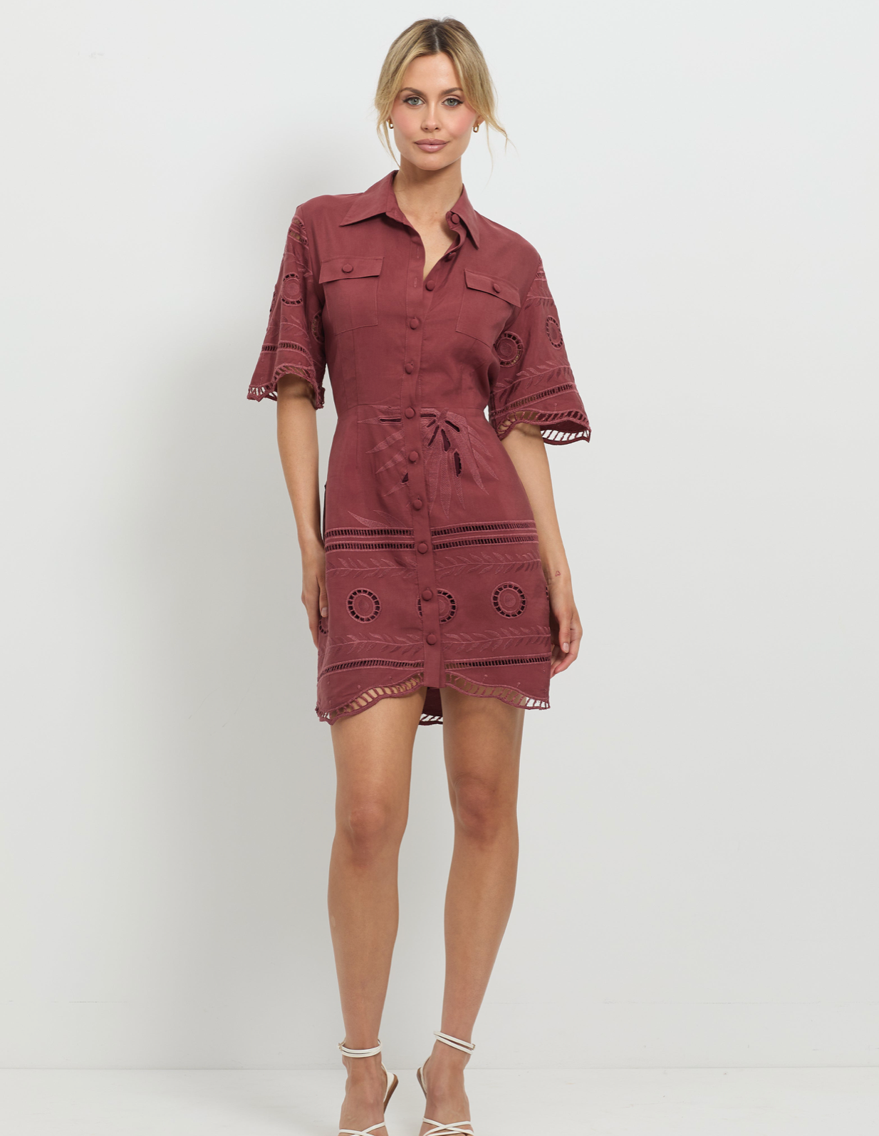 The Sunrise Shirt Dress by PASDUCHAS is crafted from an exclusive Tencel-linen blend with embroidery. It features a classic angled collar, complemented by extended sleeves and a central button placket down the front. The dress showcases an engineered texture throughout and is finished with a scalloped hem detail.