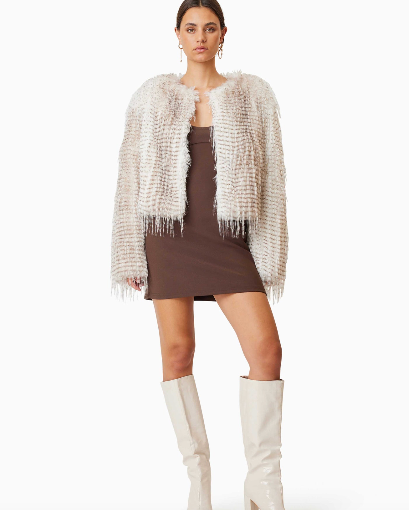 Designed with tonal faux fur, this jacket adds a luxurious touch while keeping you cozy. The centre front internal hook & eye closures create a seamless finish, ensuring a polished look whether worn open or closed. The plush texture and soft white hue make this jacket an essential statement piece for cooler seasons.