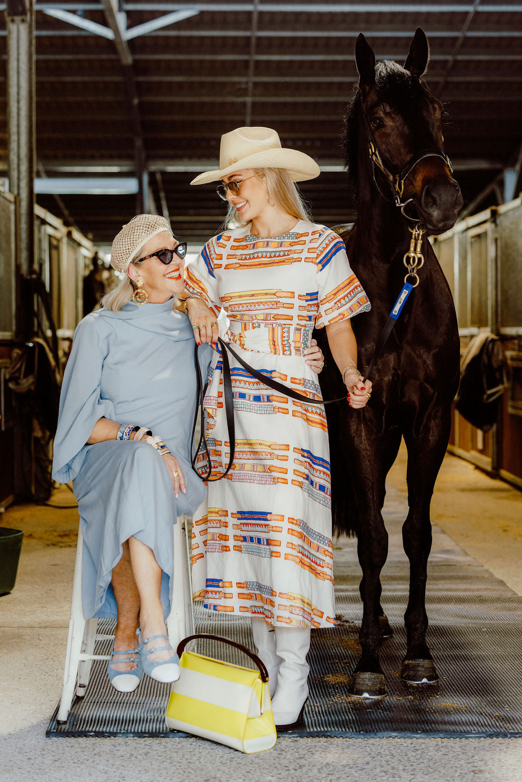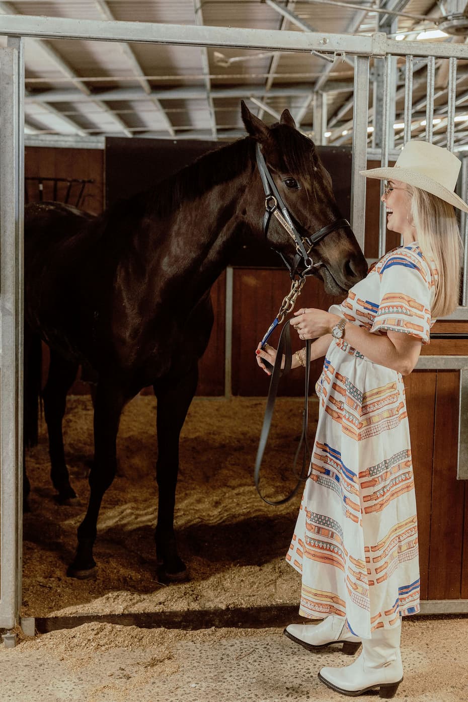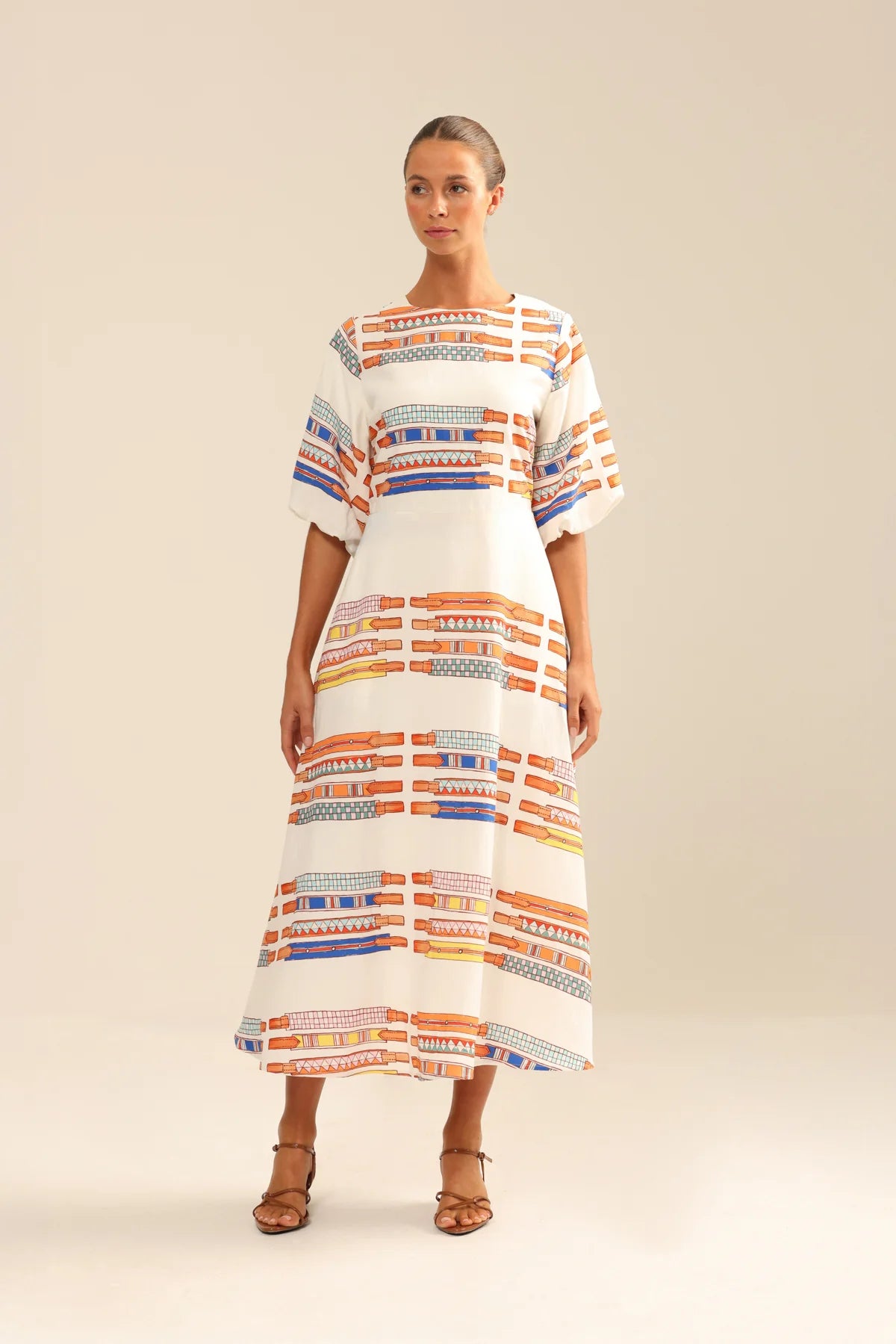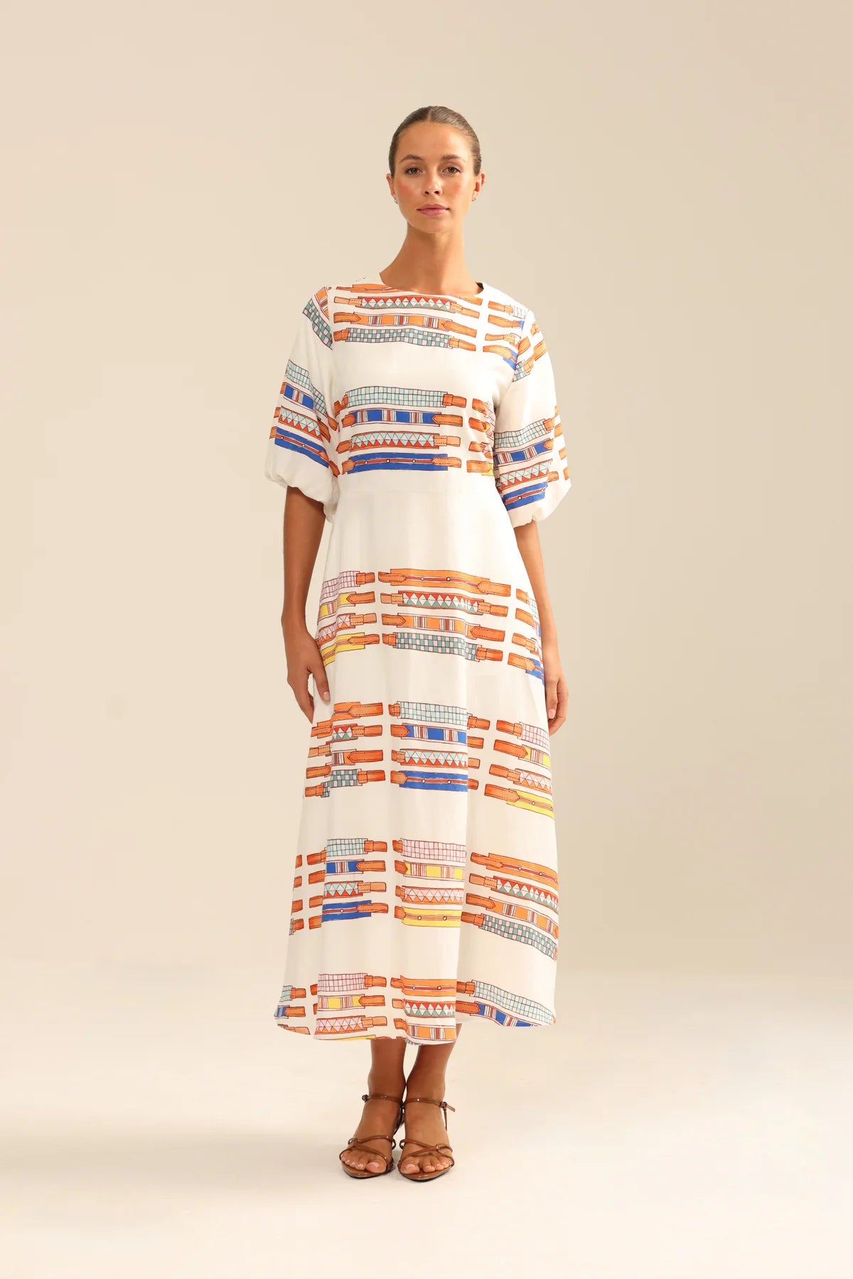 There was also nothing in the world that made our horse mad heart beat faster growing up than plaited ribbon browbands. We LOVED. So we handpainted six of them beautifully onto to this perfectly cut midi dress. Cut in a beautiful silky viscose linen blend, with gently puffed sleeves. Wear with or without self belt or add your own. Saddle Up.