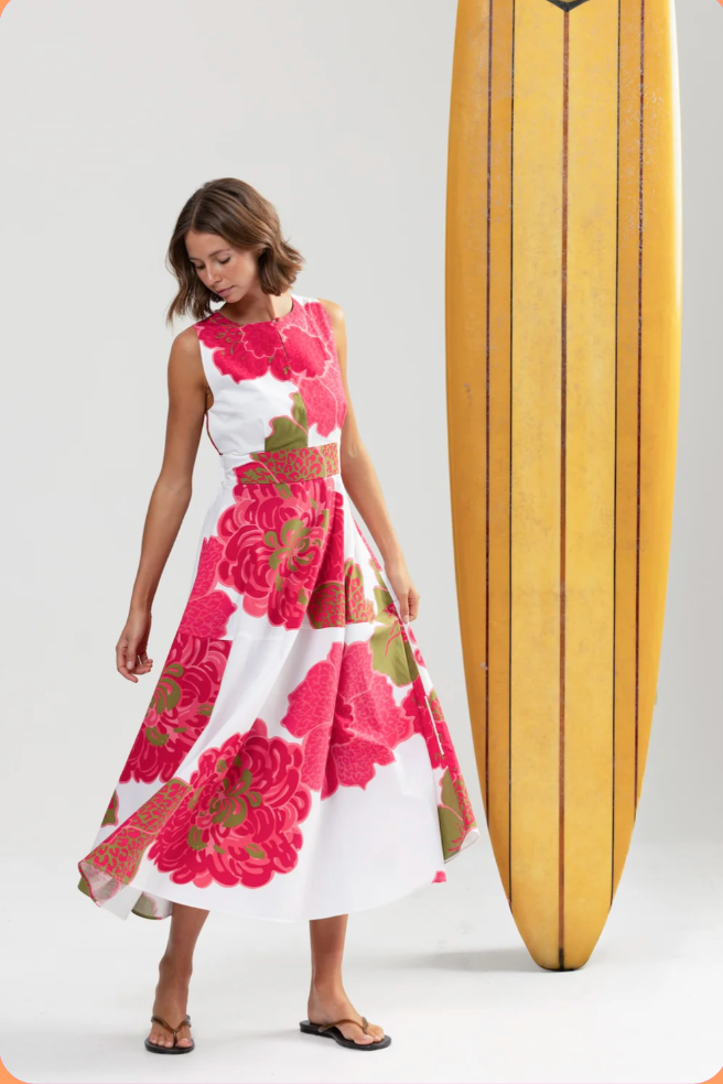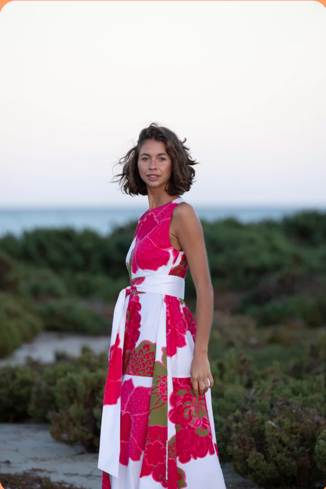 BOUGAINVILLEA (pronounced boo-gan-vil-ya) is vibrant a bit thorny, famous for its spectacular, papery, colourful flowers. Thriving in heat and sun, they add stunning colourful fun with relatively little fuss once established. Sounds like most of our friends. This dress is sure to add all of the above to many summer occasions for years to come. Spectacular papery cotton feel fabric, the perfect summer print & dress. Just add spicy margs & white kitten heeled flops for casual. Or self belt it for crisp riesling & rattan weave white flats for dressy. A brilliant multi tasker just like your fine self.