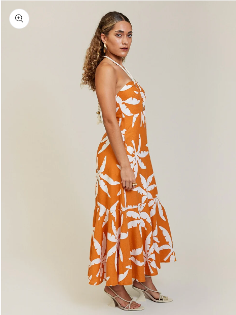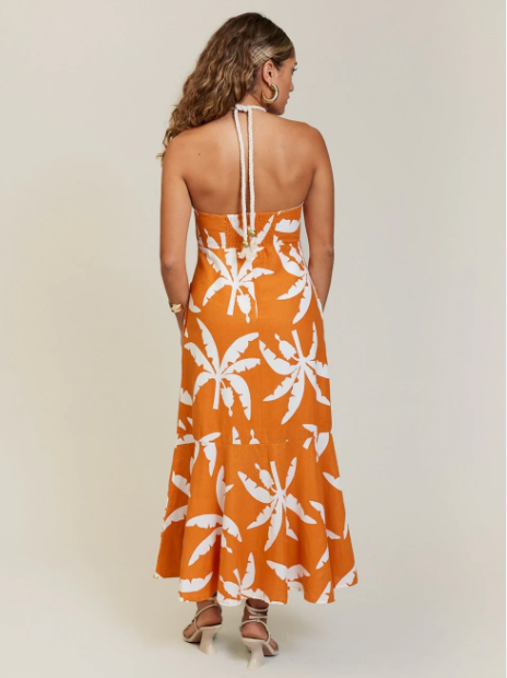 TROPICALE HALTER DRESS is crafted from signature Linen Viscose & featuring pleated bodice with a slight cutout, empire waist, shirred back with zipper, rope tie with brass beads & a fluted hemline to complete the look.
