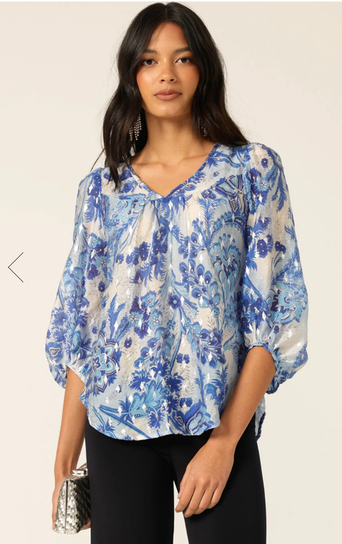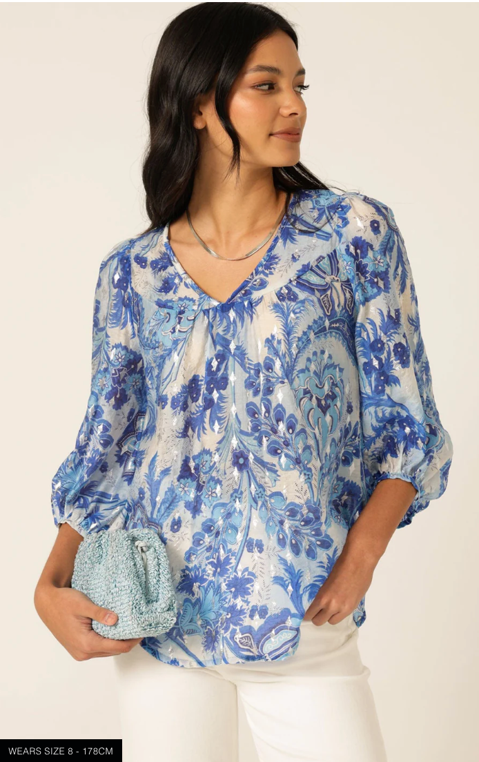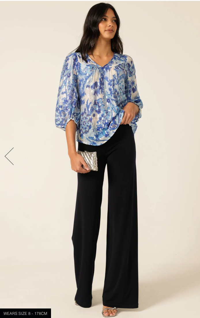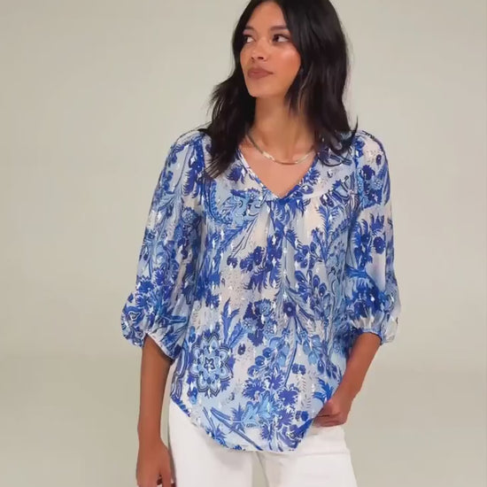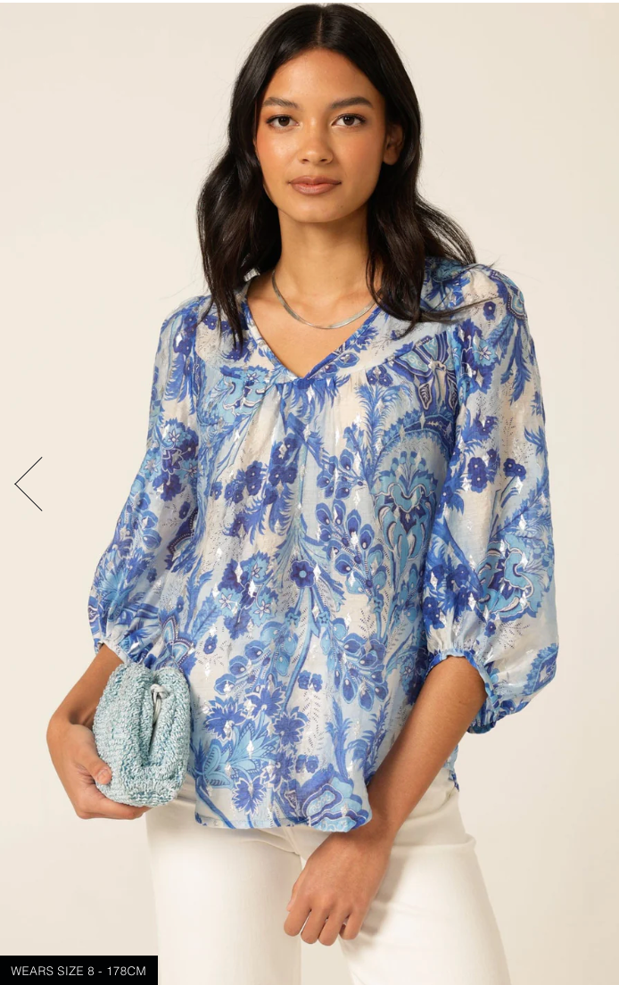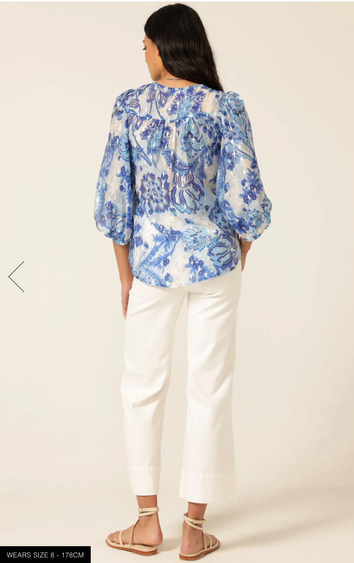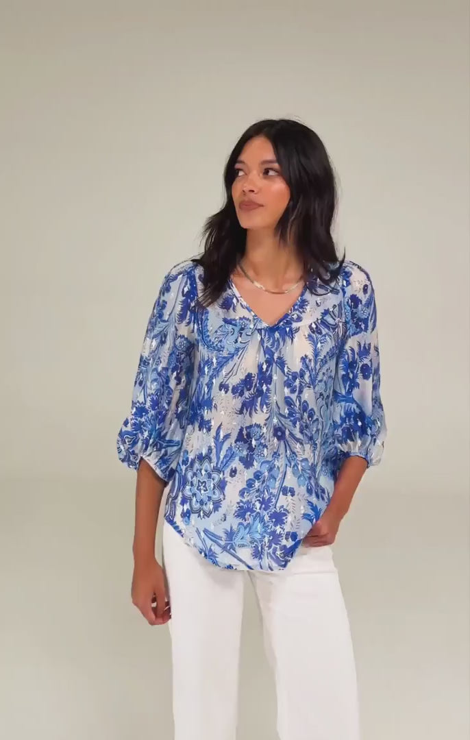 The Kassiopi Top is made from a luxurious cotton with subtle silver metallic detailing, featuring a flattering V-neckline, soft bloused sleeves, and a curved hemline. Designed in a relaxed pull-over style, it’s a versatile piece that effortlessly transitions from work to weekends and special events.